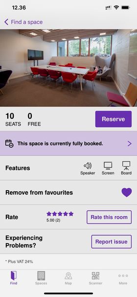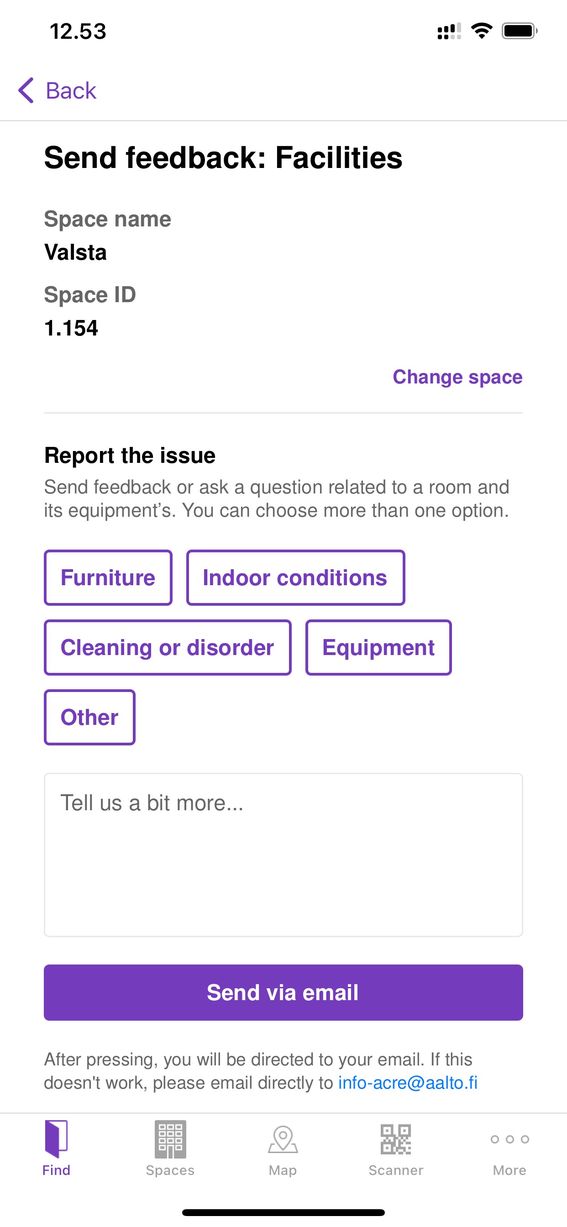 - Choose the space where you are from the map. The form can be found in the application for each space "Experiencing Problems? Report issue".