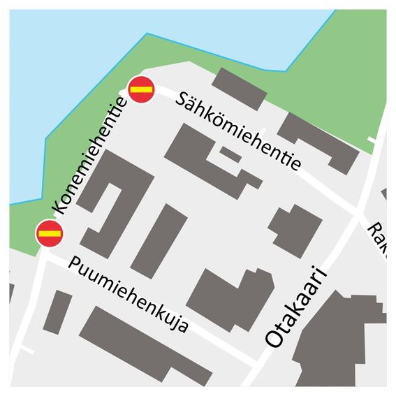 Kulku Kehä I:n suunnasta Sähkömiehentielle ja esimerkiksi Terveystalolle kulkee jatkossa siis Konemiehentie - Puumiehenkuja - Otakaari - Sähkömiehentie.