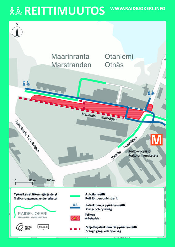Moottoriajoneuvojen läpikulku Maarintien itäosassa suljetaan lokakuun puolen välin jälkeen. Maarintien sulkemisen myötä henkilöautoliikenne siirtyy pääasiassa Tekniikantielle ja Tietotielle. Tietotien ja Tekniikantien kohdalla on syytä varautua normaalia pidempiin matka-aikoihin etenkin aamu- ja iltapäiväruuhkan aikaan. Jalankulun ja pyöräilyn yhteys säilyy Maarintiellä koko rakentamisen ajan, mutta sen reitti vaihtelee kadun itäosassa työvaiheiden mukaan.