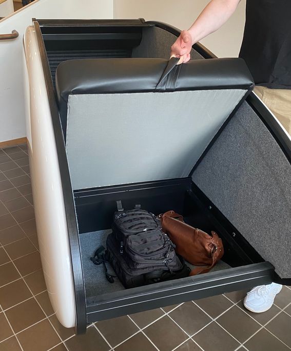 - Pidä torkkumiskapseli siistinä ja jätä se siistiin kuntoon lähtiessäsi. Kapselin patjan alla on säilytyslokero, johon voit jättää vaikkapa repun torkkujen ajaksi. Lisäksi kapselissa on usb-liitäntä esimerkiksi puhelimen lataamiseen.
