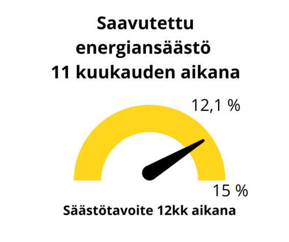 Koko 15 prosentin vuositavoitteesta on 11 kuukauden (lokakuu 2022-elokuu 2023) aikana saavutettu noin 80 prosenttia.Tavoitteemme on korkea, mutta ei mahdoton: elokuun loppuun mennessä energiaa on säästetty upeat 12,1 prosenttia. Vielä on loppukirin aika.